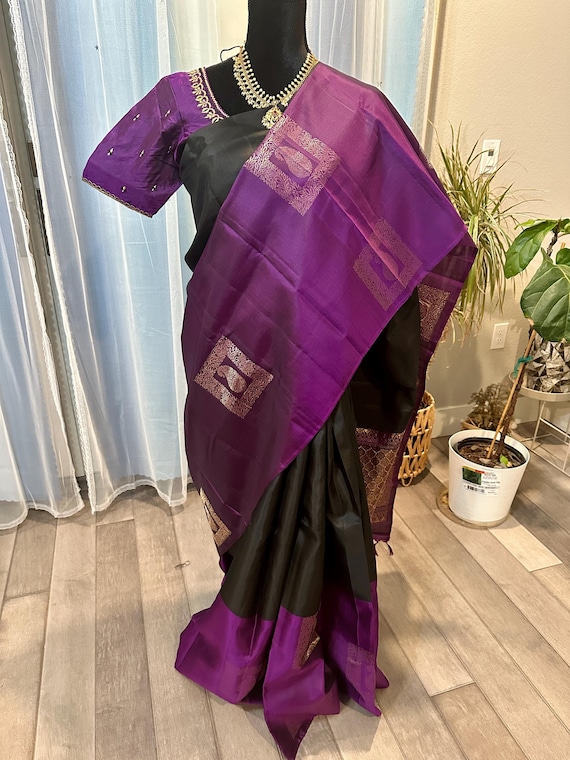 Size 36-44 stitched blouse | Black bhagalpuri, handwoven silk cotton saree | Handwoven sico sarees online shopping usa | black saree blouse