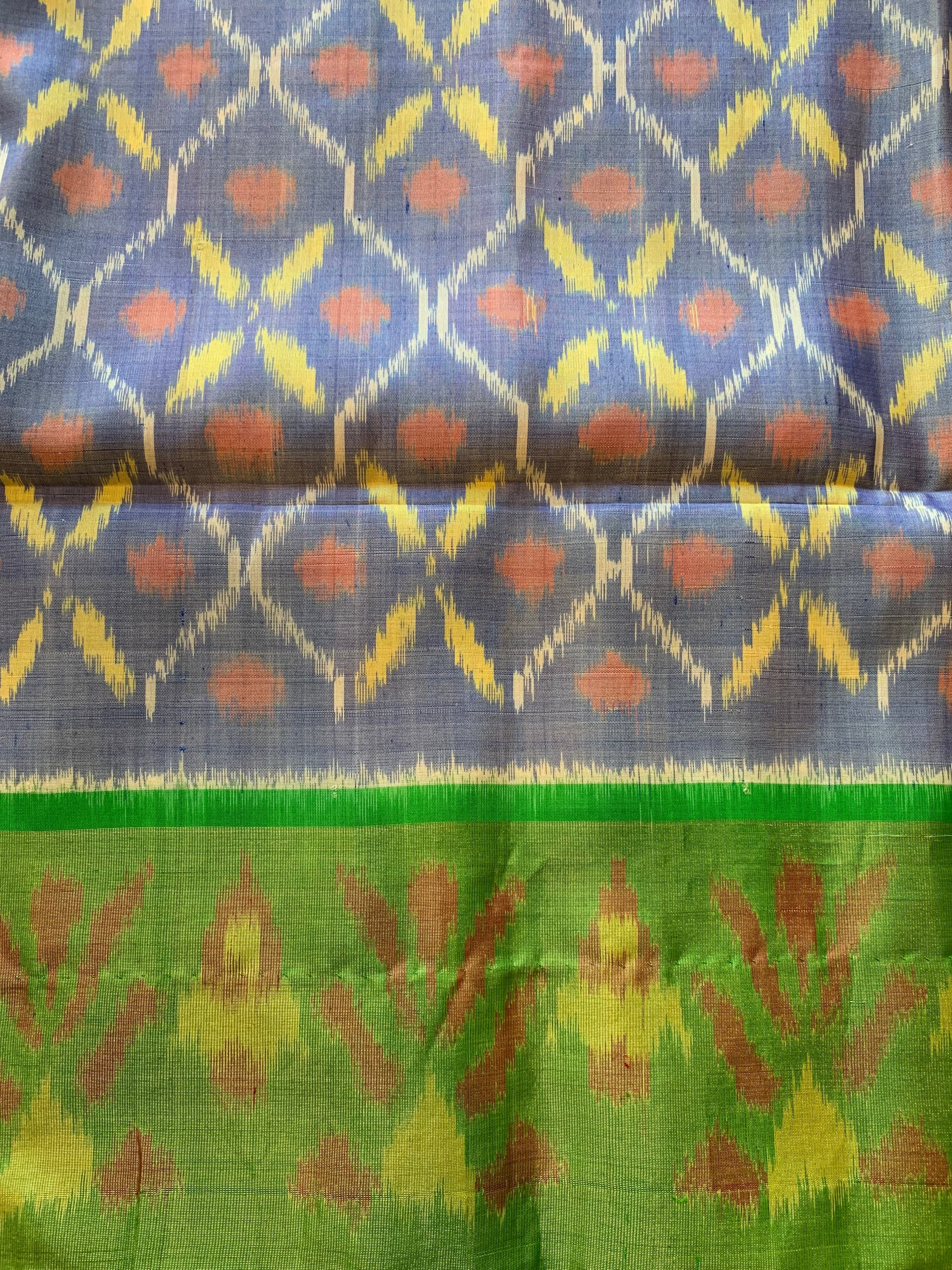 Own this timeless elegance Ikkat Pochampally pure silk saree that comes with tassels done. The saree boasts and brings out the brighter you, giving a rich and grand look to your occasion. This saree is silk mark certified pure silk saree with contrast border and blouse piece included.
