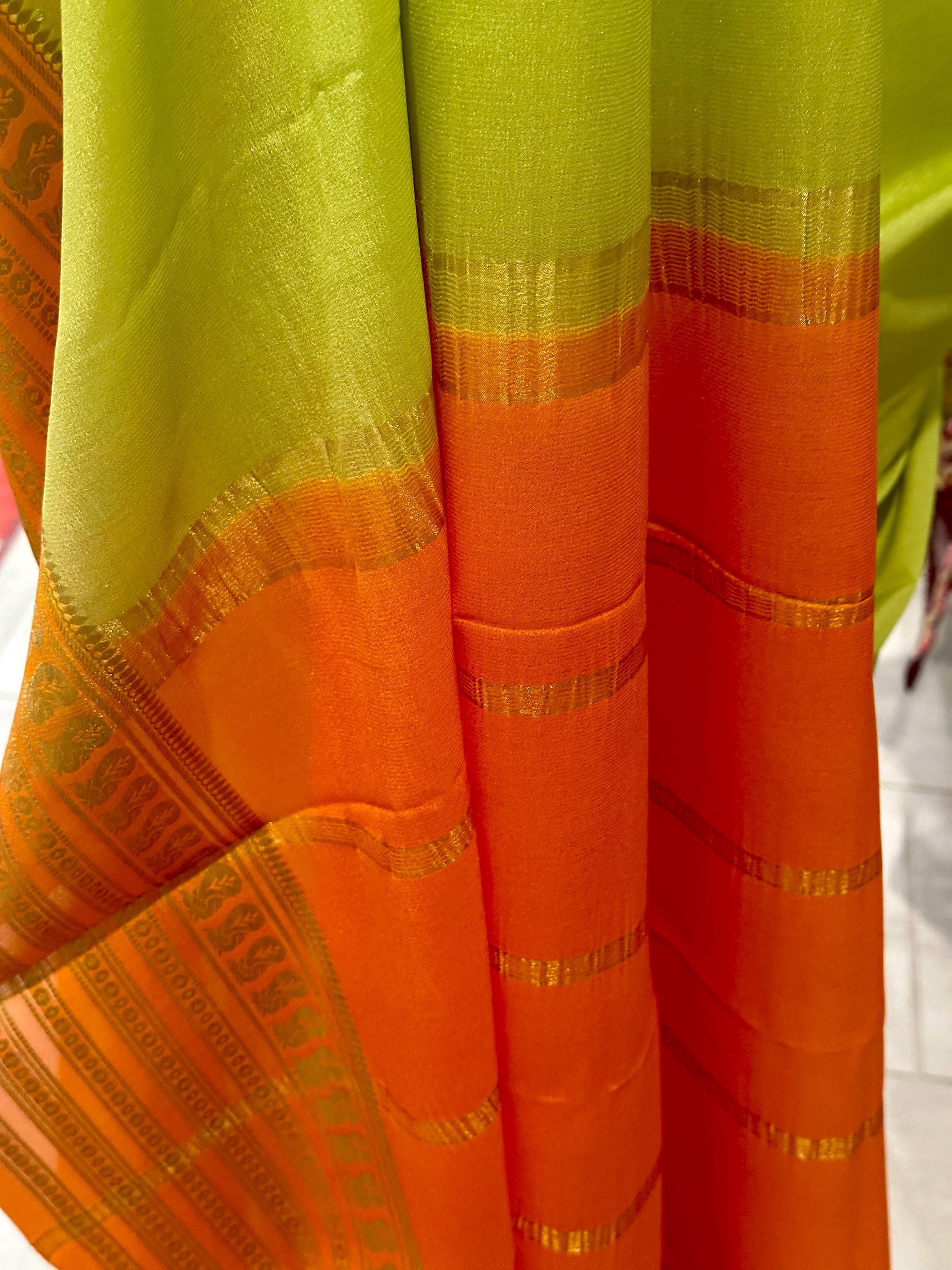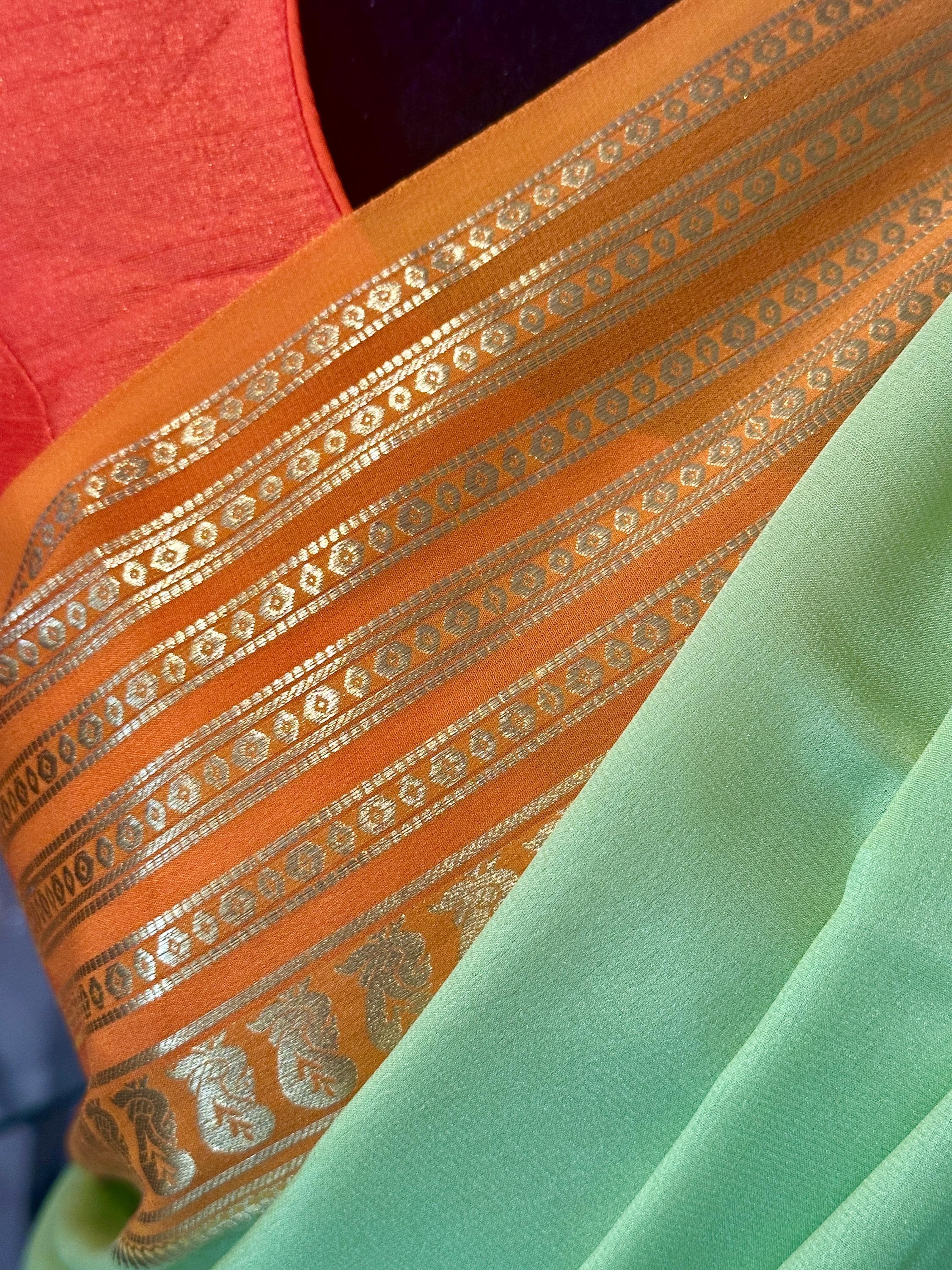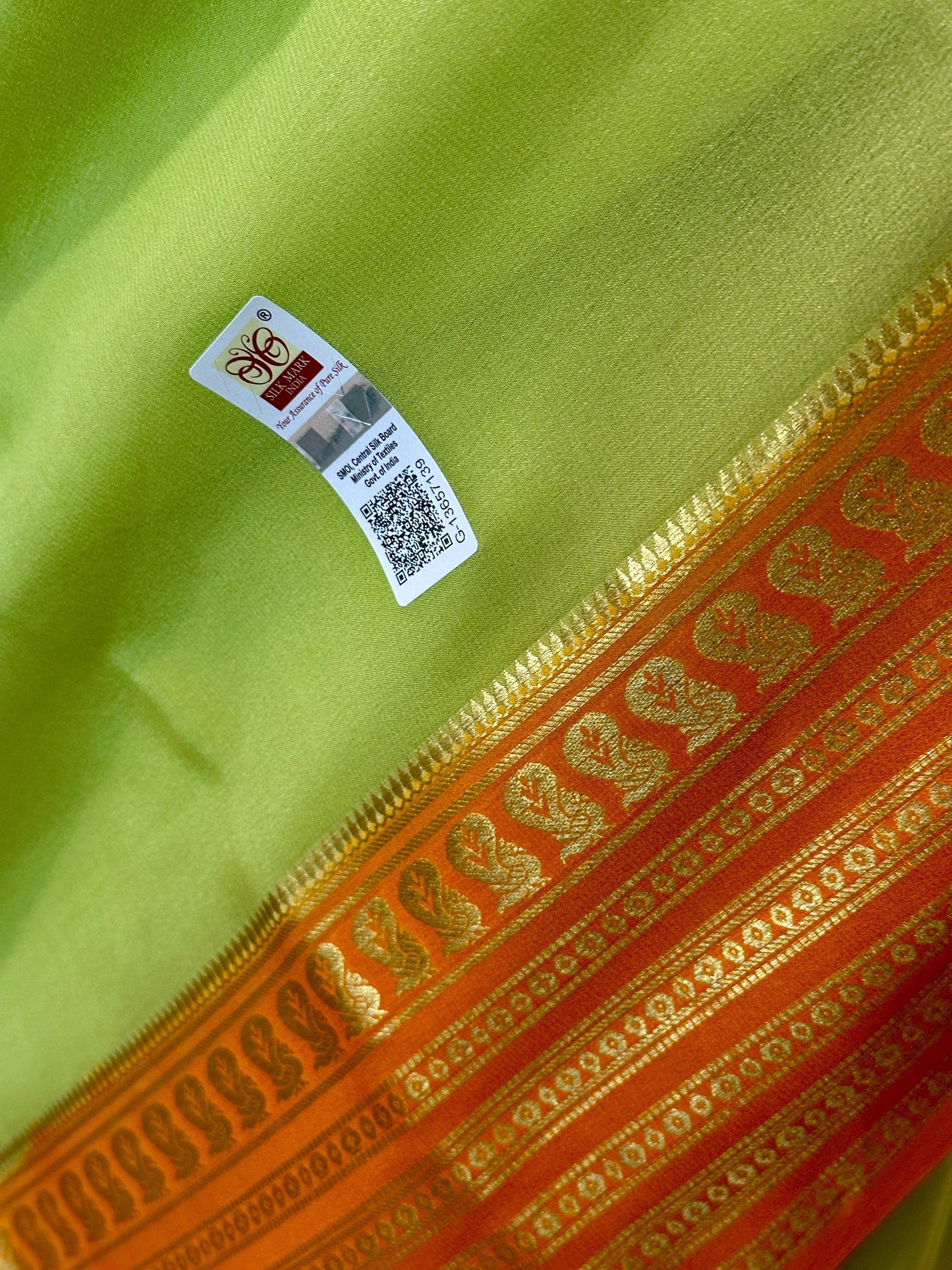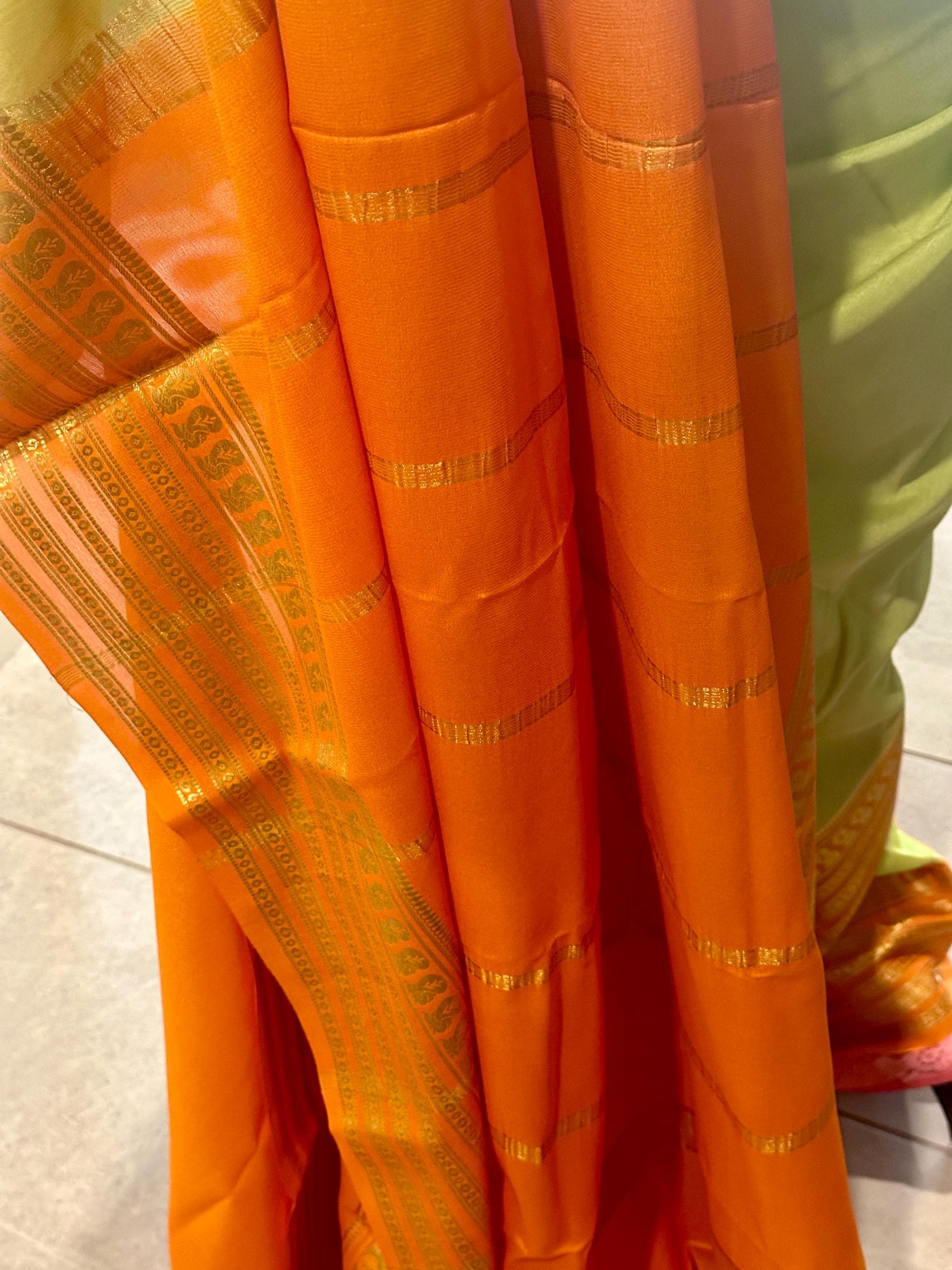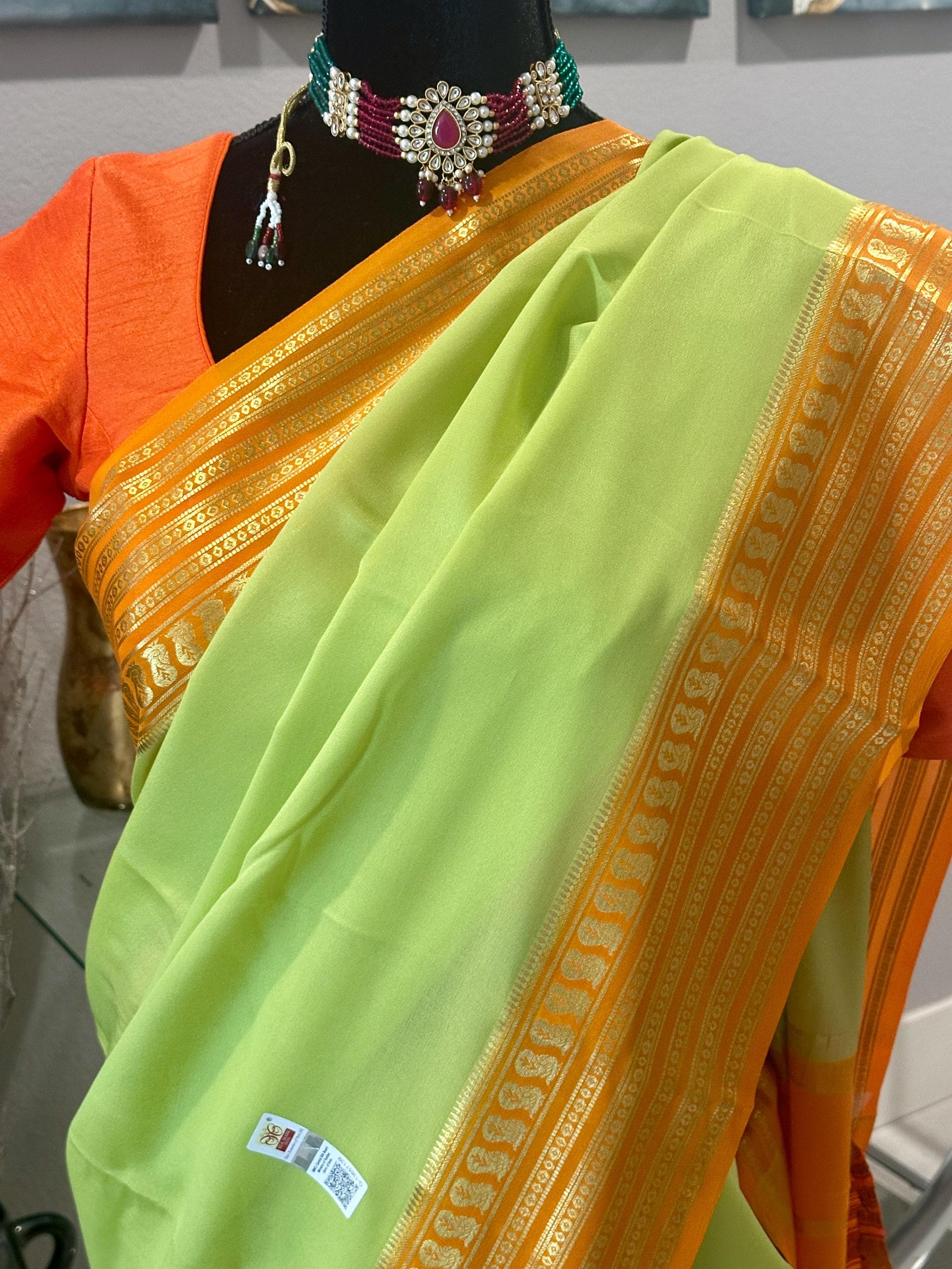 This a lovely, 75 gsm thick, pure, silk mark certified mysore crepe silk saree in light pista green shade. Pallu is zari chit pallu. The saree comes with an attached blouse piece in orange shade.