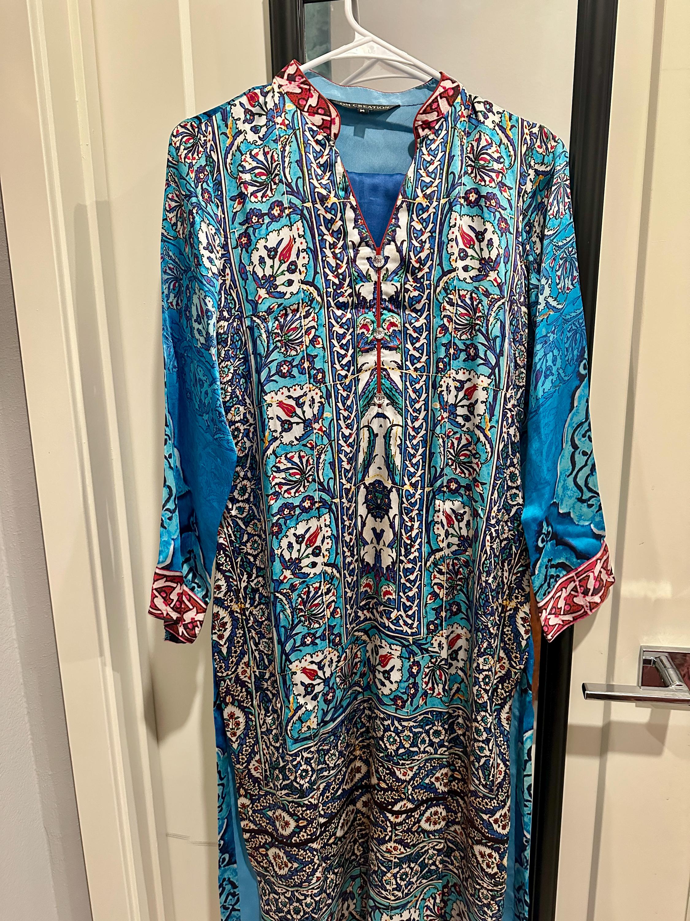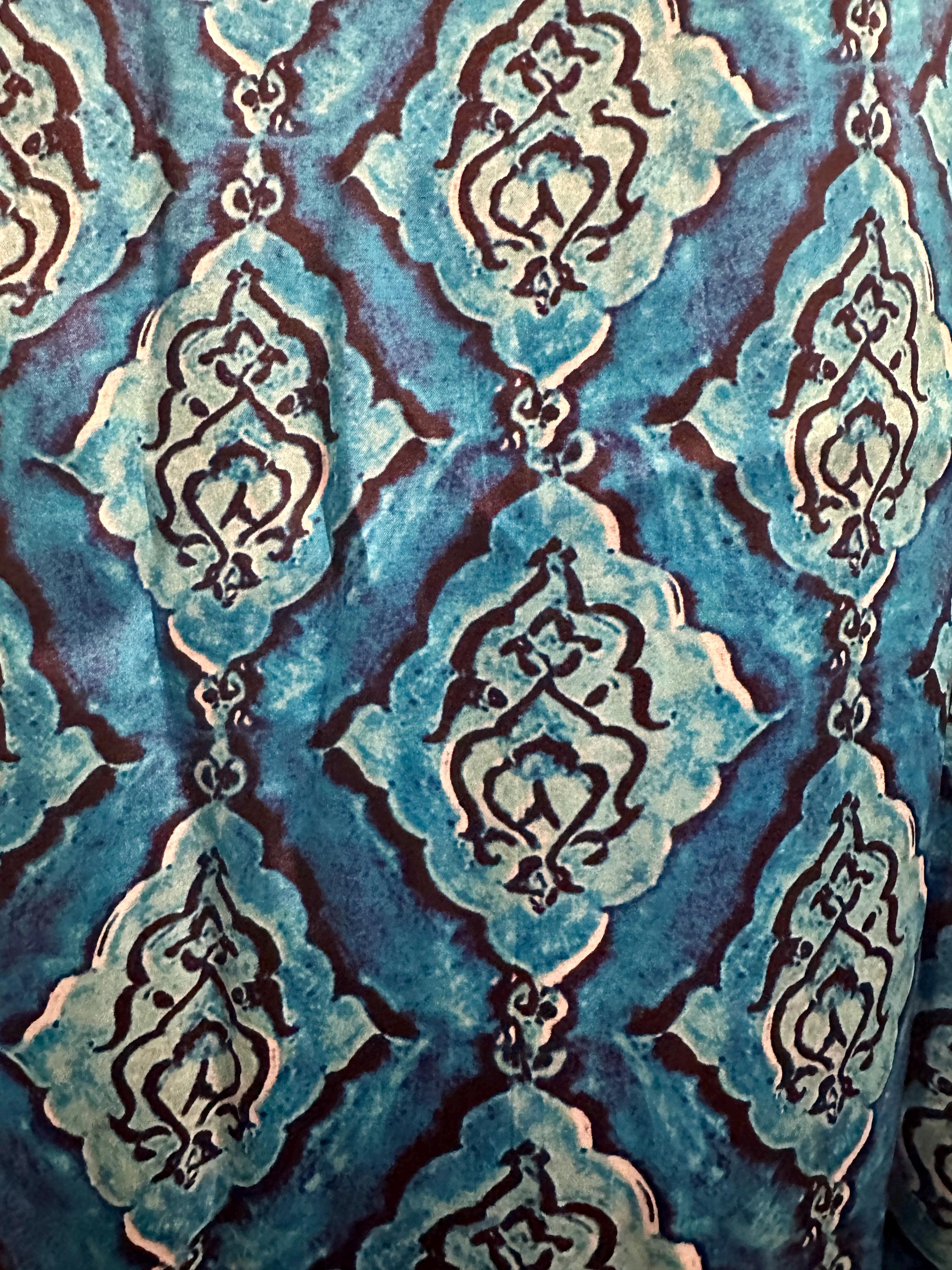 Super gorgeous, modla silk salwar suit set with kurti and pants in cool blue shade. The set includes pant and kurti but no dupatta. The kurti is lined and pant is straight pant. Adorning the kurti are ajrakh prints that are super trendy.