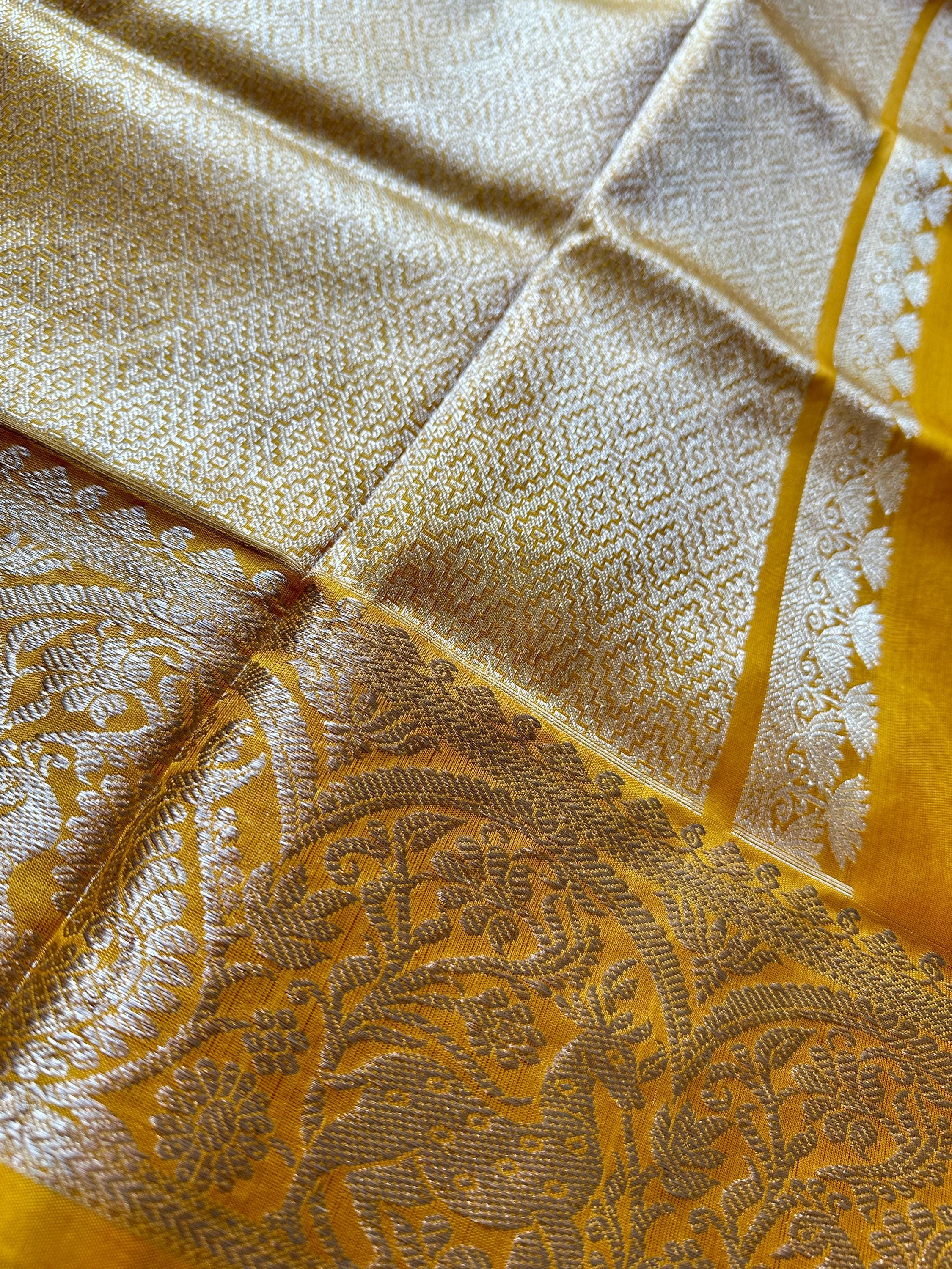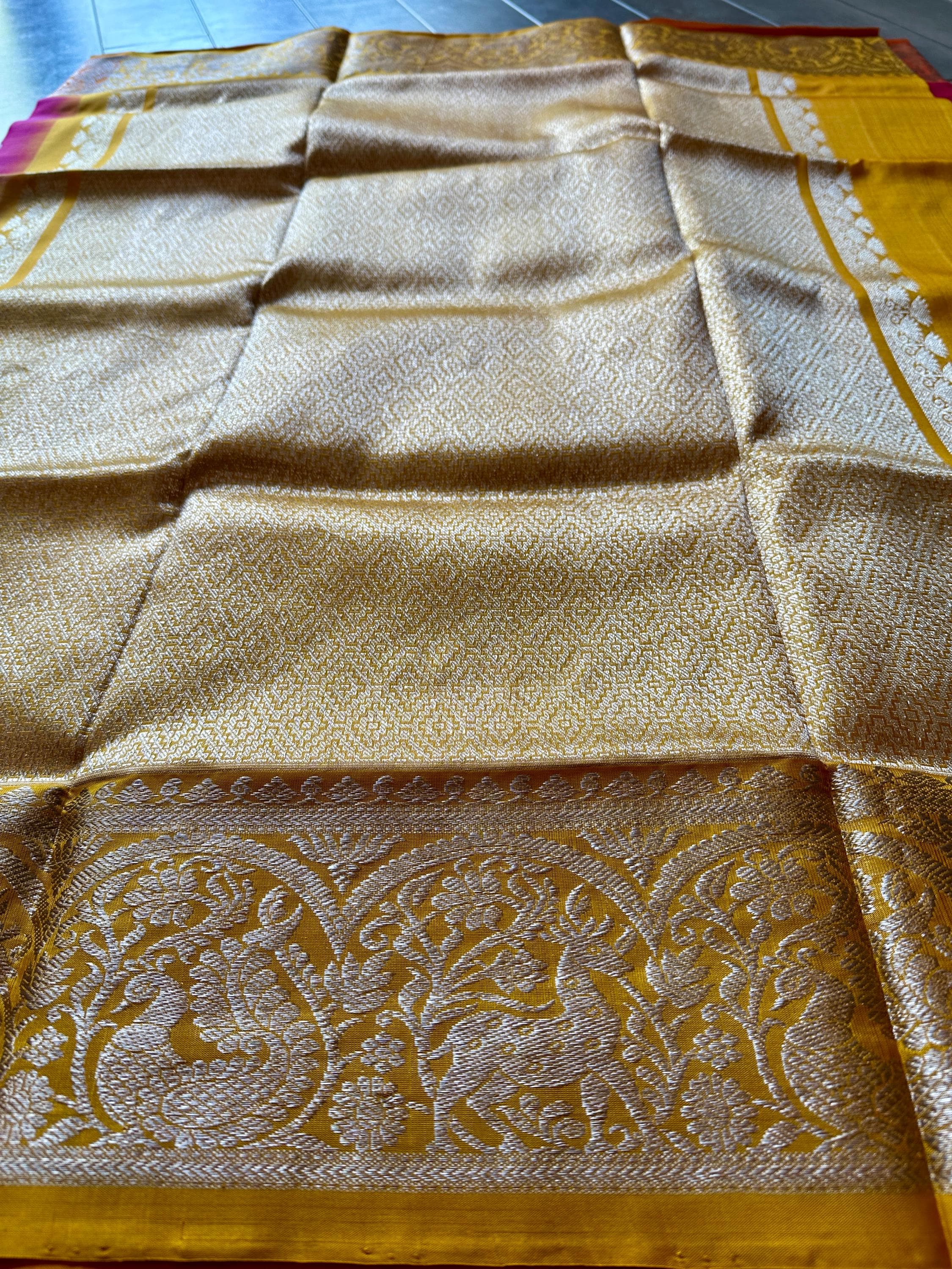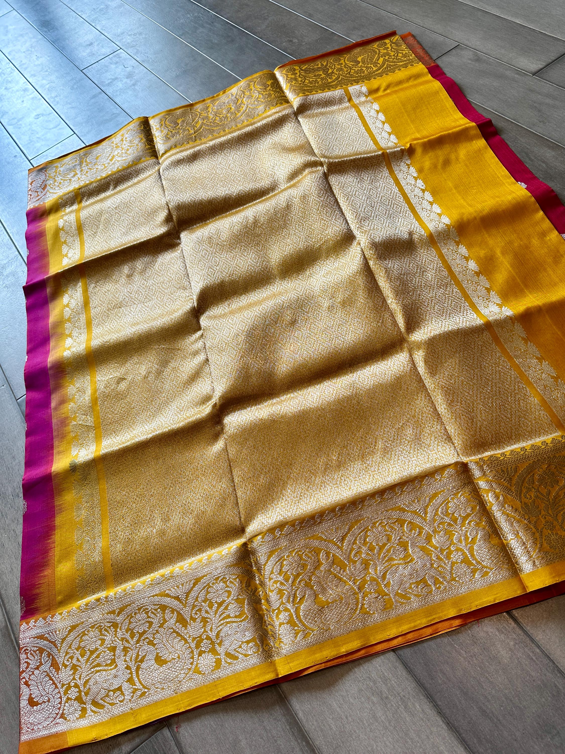 Royal, grand and light weight Venkatagiri pure silk saree that is handwoven to perfection! The saree is a Magenta shade and bordered by mango yellow border. Seen adorning the saree are small silver intricately designed bhuttis and also an intricately designed border. Pallu is rich with silver zari and blouse piece comes attached to the saree is mango yellow shade.