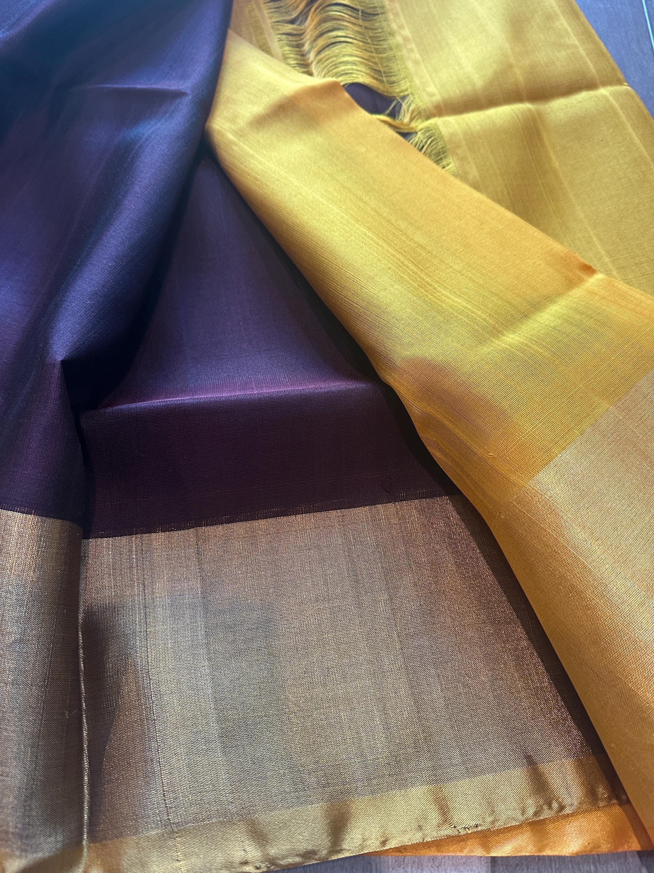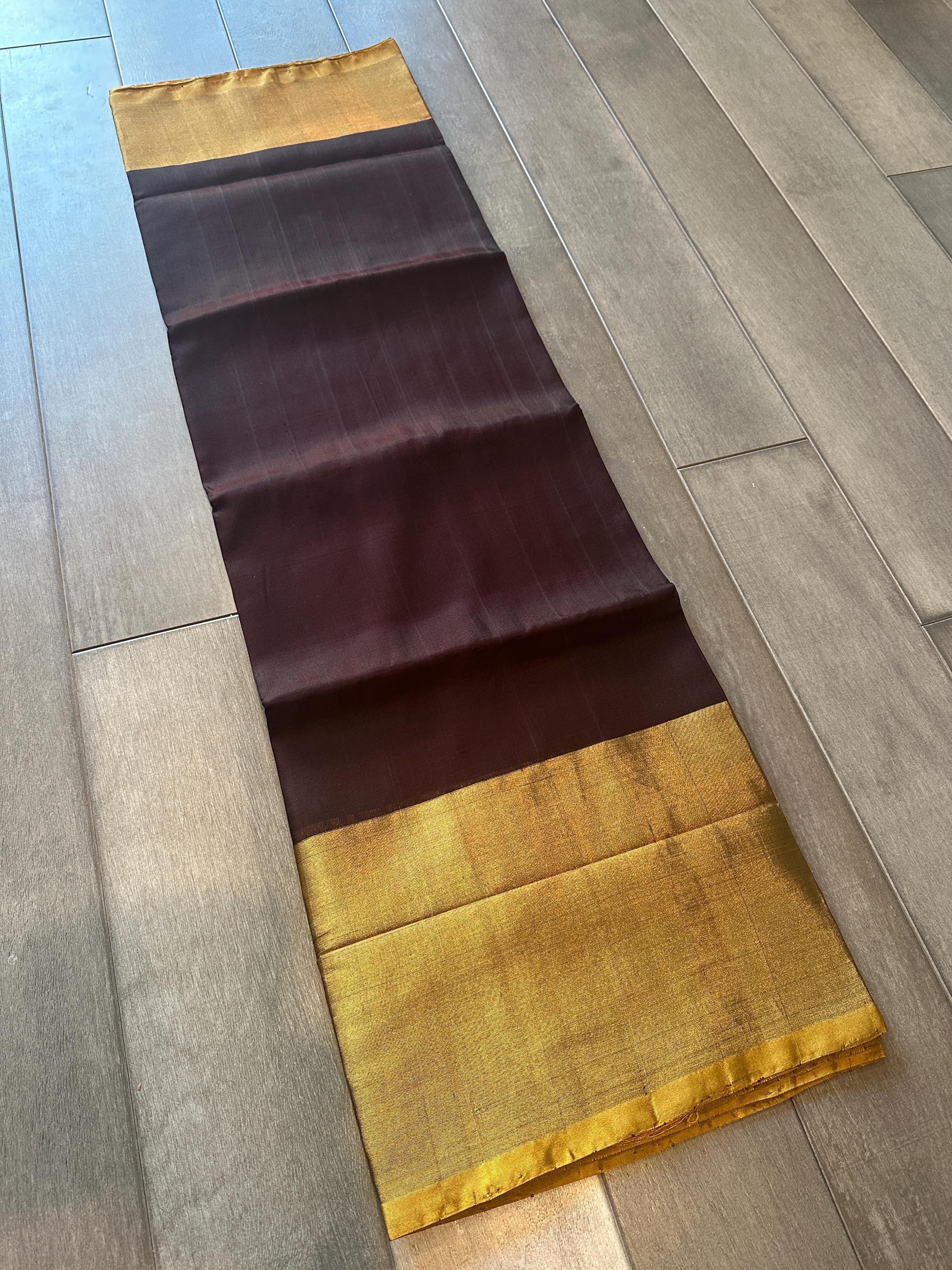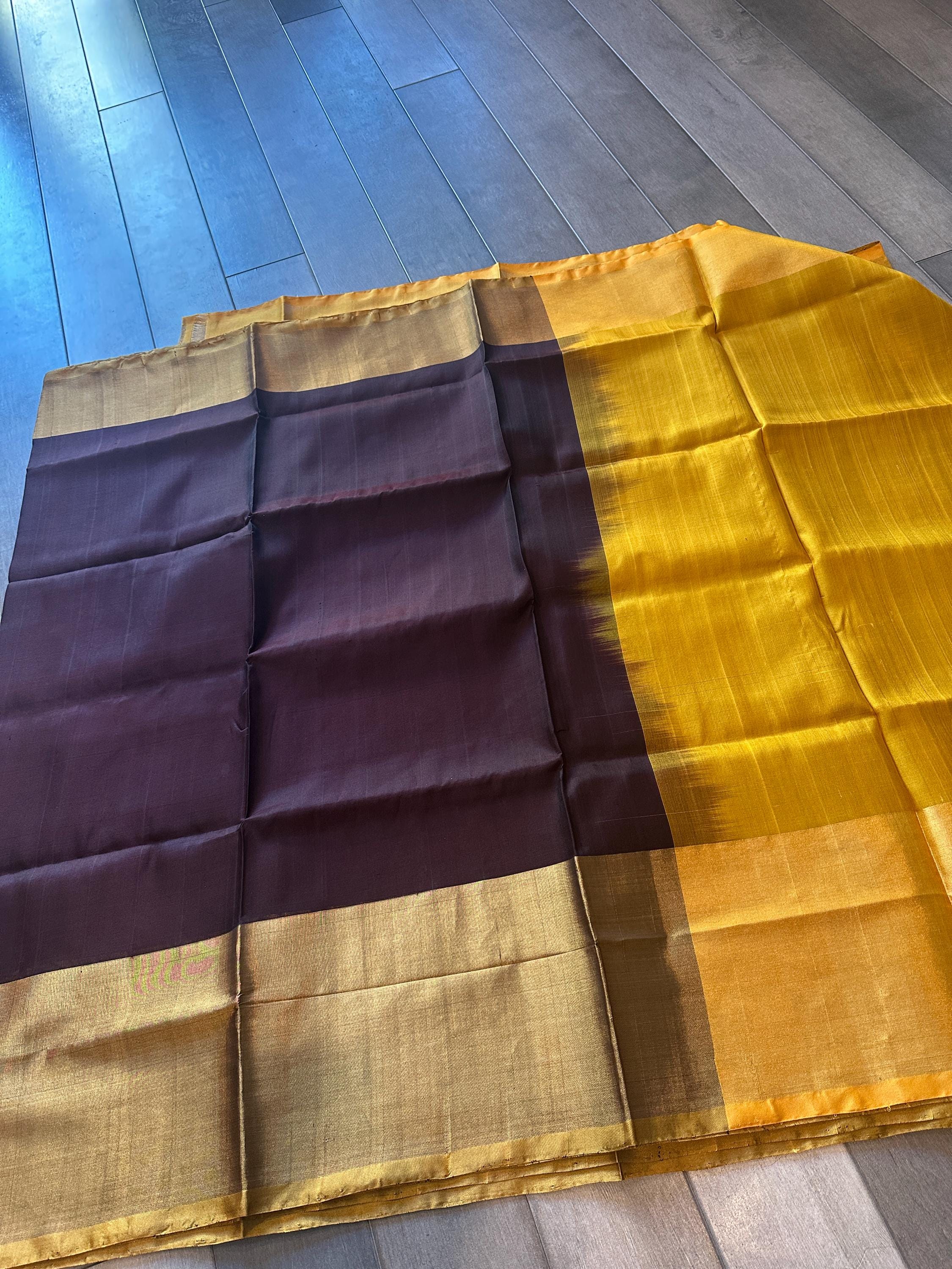Beautiful, handwoven uppada silk saree with big zari border and plain body and pallu. The saree is a brown chocolate shade and border with yellow zari border and yellow pallu. The saree comes with a blouse piece attached. The saree is best suited for weddings, housewarming, grand festivals. An optional stitched blouse, as shown in the pics is available for purchase.