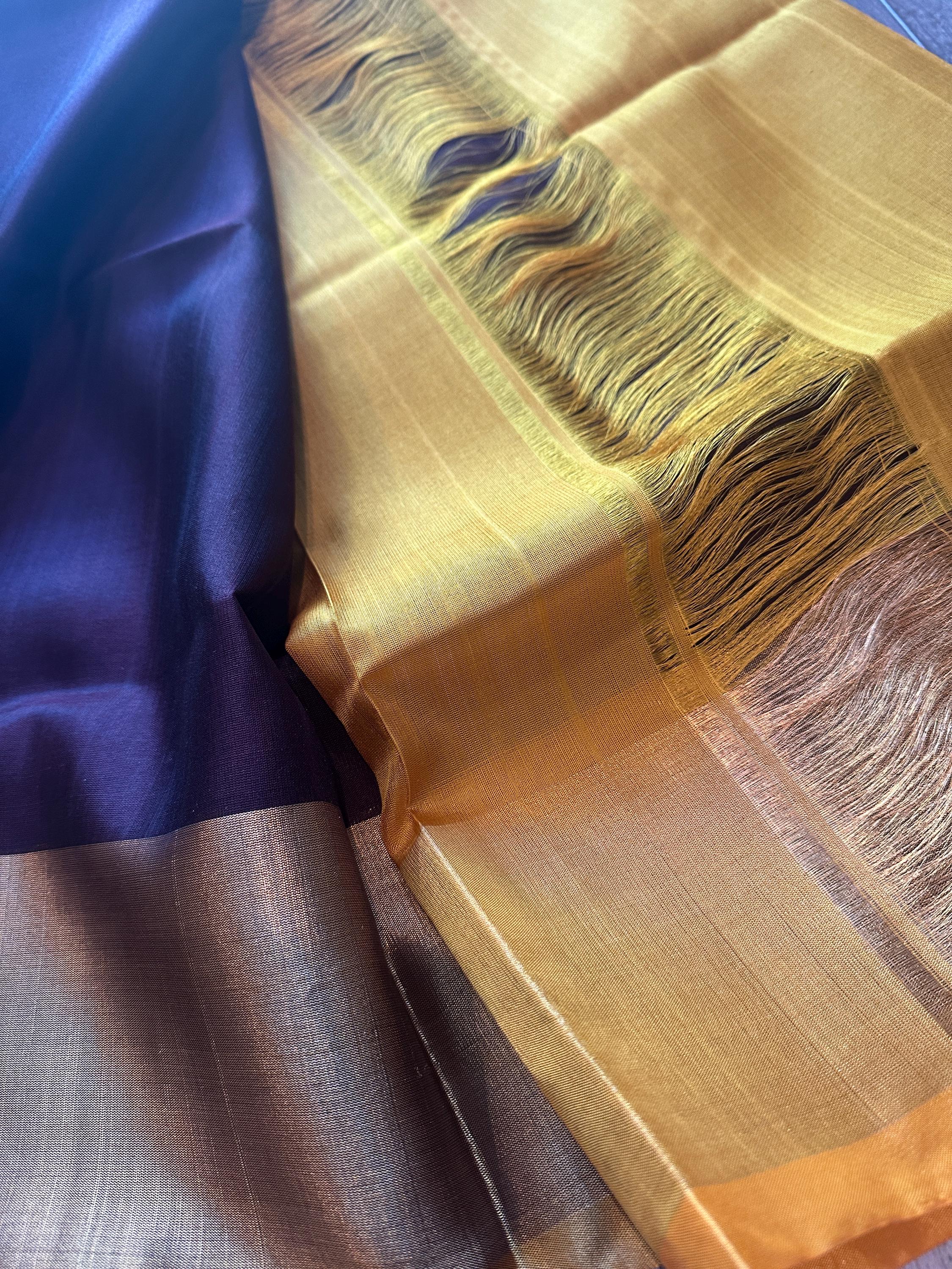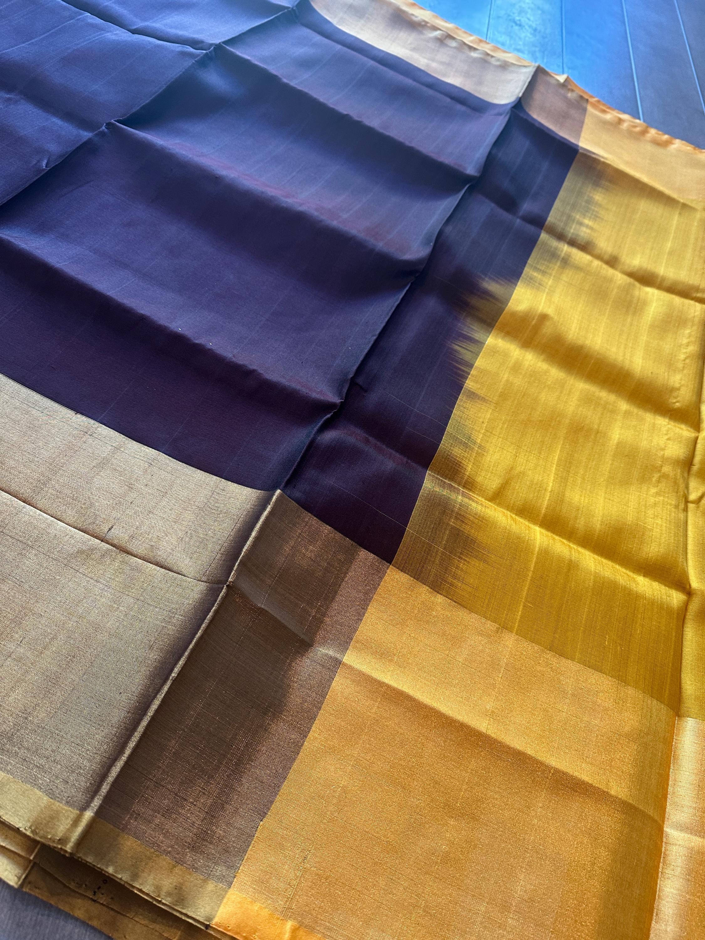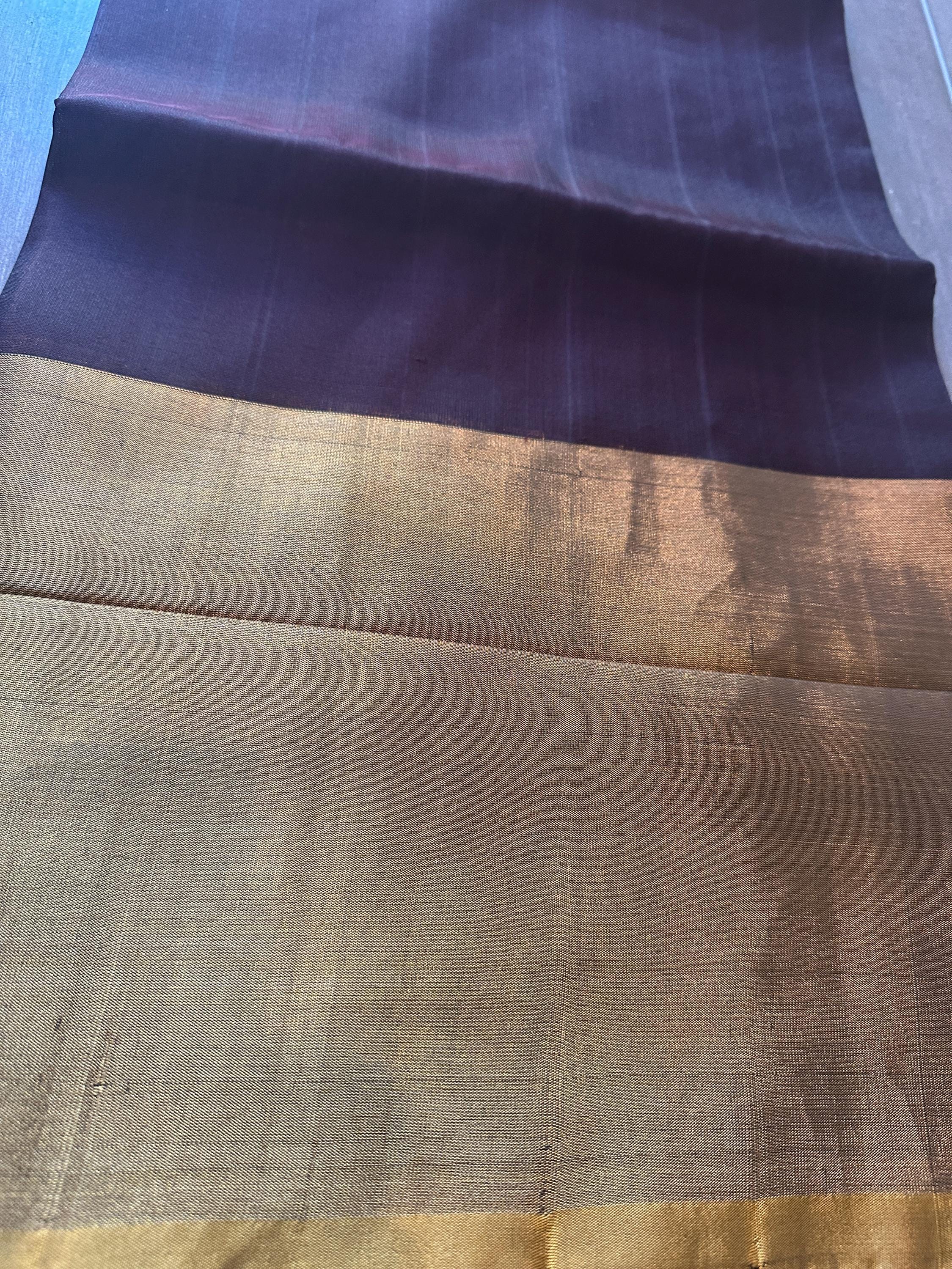 Beautiful, handwoven uppada silk saree with big zari border and plain body and pallu. The saree is a brown chocolate shade and border with yellow zari border and yellow pallu. The saree comes with a blouse piece attached. The saree is best suited for weddings, housewarming, grand festivals. An optional stitched blouse, as shown in the pics is available for purchase.